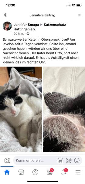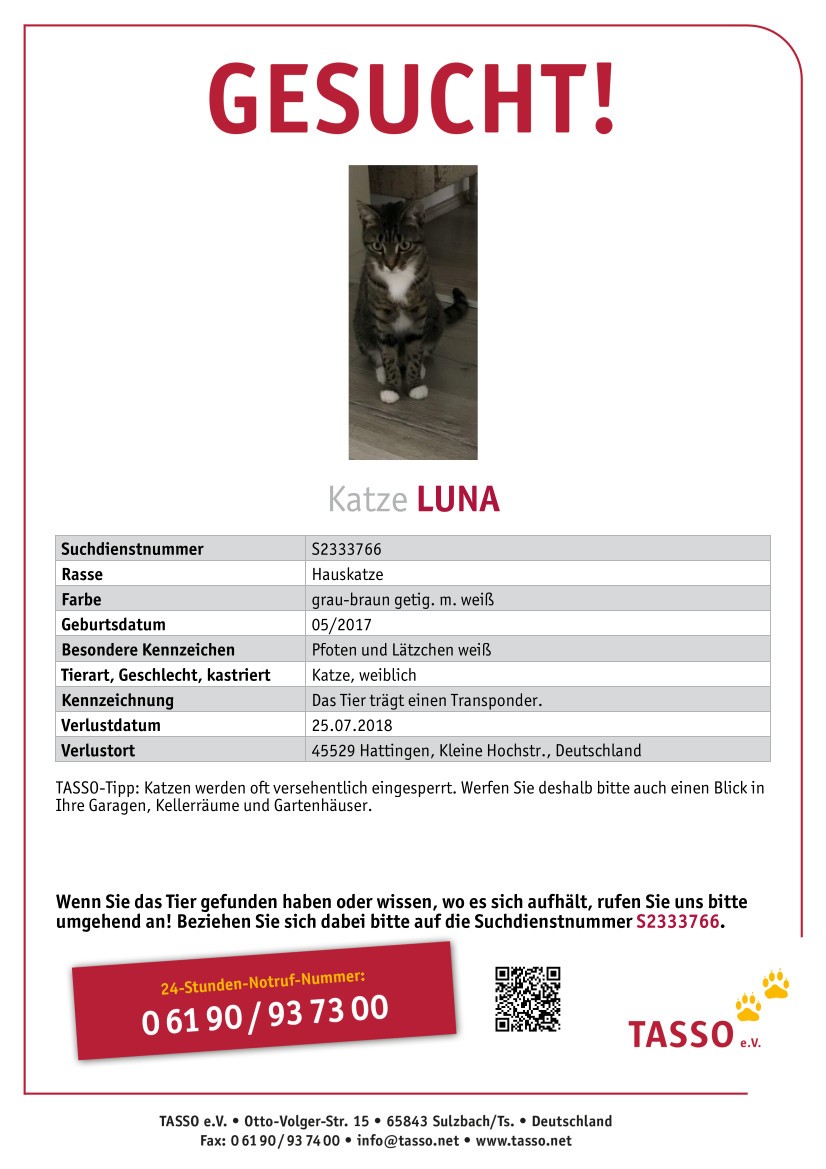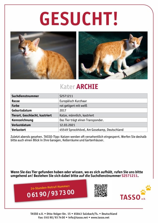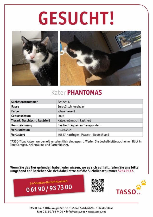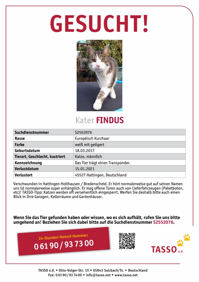 Was zusätzlich noch helfen kann, sind das Posten einer Verlustnachricht auf Facebook, örtliche Tierheime oder Tierschutzvereine kontaktieren – z. B. uns – oder das Schalten einer kostenlosen Verlustanzeige auf Ebay-Kleinanzeigen. Zudem sollten Sie eine Suchanzeige bei Tasso, Ifta oder dem Deutschen-Haustierregister findefix aufgeben. Für Katzen aus dem ausländischen Tierschutz können Sie auch eine Chipsuche bei Europetnet und Petmaxx durchführen.