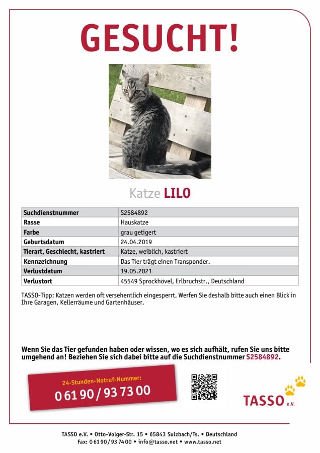 Ihre Katze ist entlaufen? Wie Sie sich verhalten sollten, ist ausführlich auf tasso geschildert. Auch das Deutsche Haustierregister bietet eine Anleitung zu diesem Thema.